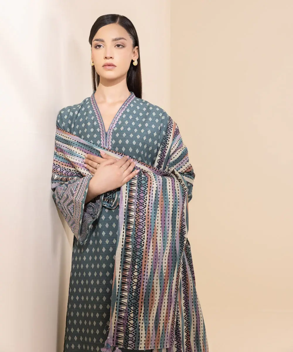 Step out confidently this fall in our printed hunter green and multi coloured 3-piece featuring a light khaddar shirt  and solid trousers.