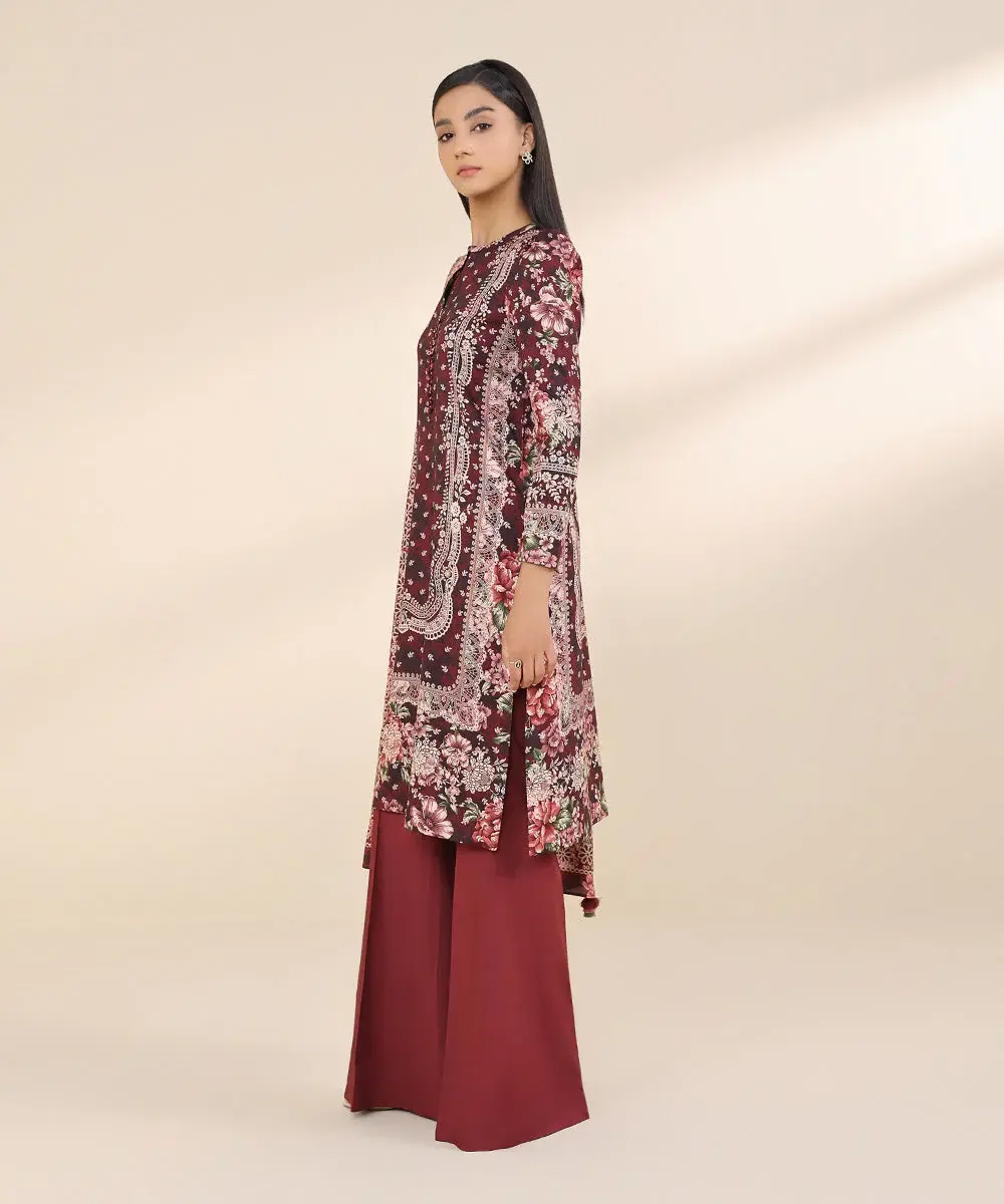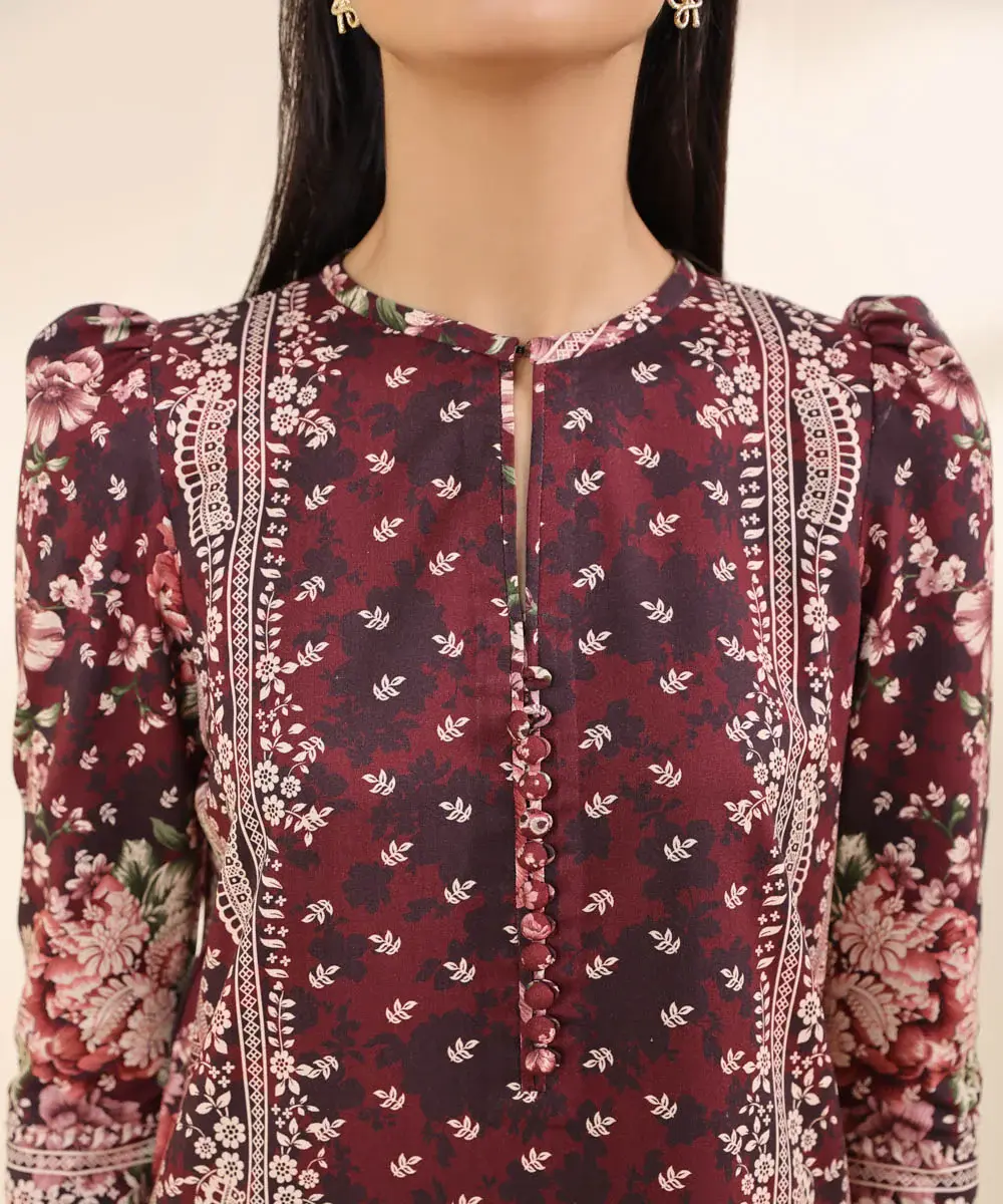Embrace winter chic in our garnet red three-piece linen printed suit, dupatta and solid trousers.